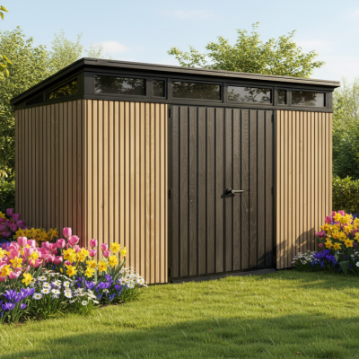 Met zijn strakke lijnen, ingebouwde ramen en aflopend dak, is dit tuinhuis een stijlvolle aanwinst voor elke tuin.