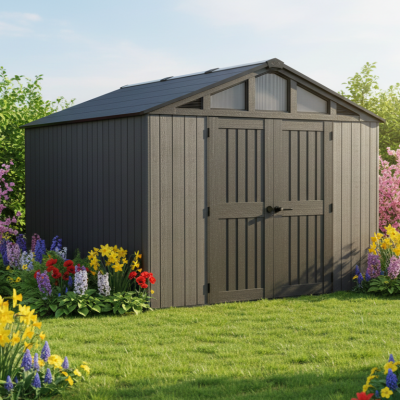 Met een royale opslagruimte van 10,7 m² biedt dit tuinhuis voldoende plaats voor grote en kleine spullen. De brede dubbele deuren (152,5 cm) maken het gemakkelijk om grote apparatuur zoals een grasmaaier of tuinmeubelen naar binnen te rijden. Bovendien zorgen ingebouwde ventilatieroosters voor een continue luchtcirculatie, waardoor vocht en condensvorming worden geminimaliseerd.